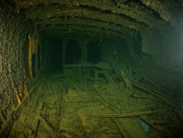 Śródokręcie wraku jest najbardziej zniszczone. W pobliżu miejsca, w którym statek został trafiony torpedami na prawej burcie, pokład i burty zapadły się, tworząc plątaninę blach, lin stalowych i kabli. Niemniej jednak, dalej można dostrzec elementy osprzętu: olbrzymie knagi, zawory i rury do transportu paliwa.